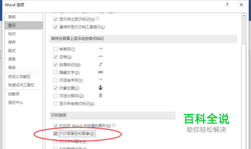 6、在“显示”选项卡栏的右侧窗格中,找到“打印选项”区域下的“答应背景色和图像”选项,并将其勾选即可。如图所示;