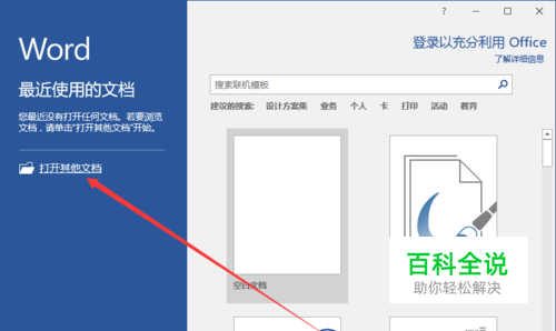 1、在计算机桌面上的Word2016文档程序图标双击鼠标左键,将其打开运行。并点击“打开其他文档”选项,打开需要进行编辑或者修改的Word文档。如图所示;