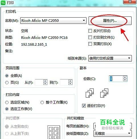 在键盘,点击快捷键“CTRL+P”,打开“打印”界面,选择打印机“属性”,点击;