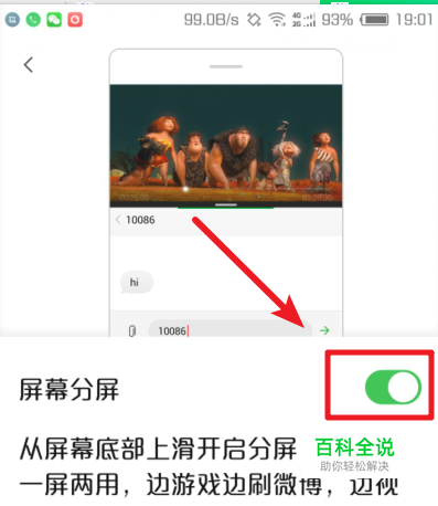 我们打开后,手机自动进入分屏模式。屏幕分成了两部分,可以在上下部分分别打开应用。同时,也可以拖动中间的分界线来调整上下两部分窗口的大小。