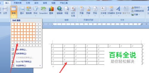第一种方法,单击插入,在功能区域中选择表格,在弹出的下拉列表框中会出现8行10列的表格。