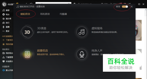 蝰蛇音效用以增强音质,如图点击不同图标可设置3D美音、虚拟现场、超重低音、纯净人声四种音响效果。