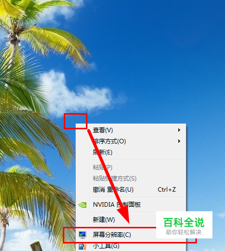 在桌面的空白处点击鼠标右键,弹出菜单中选择“屏幕分辨率”栏,进行显示的设置。