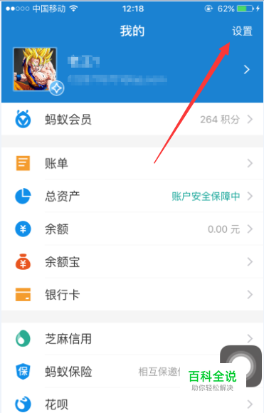 进入个人中心之后,点击右上角的“设置”按钮,可以进入支付宝的基本功能设置,如图所示。