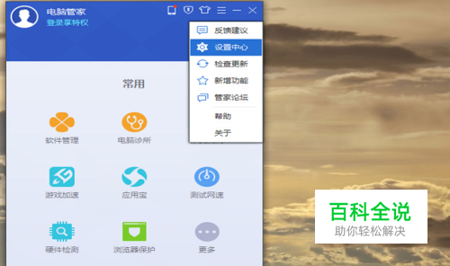 以上图为例,是管家软件,选择管家软件右上角的横条形菜单,进入到<设置中心>功能中,如下图所示