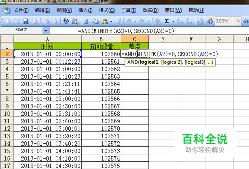 我们先来进行整点的处理,这里我将会说到两种方法,一种是辅助列与公式的配合,一种是高级筛选,各有各的特点。首先我们来建辅助列,在C2中输入=AND(MINUTE(A2)=0,SECOND(A2)=0)。