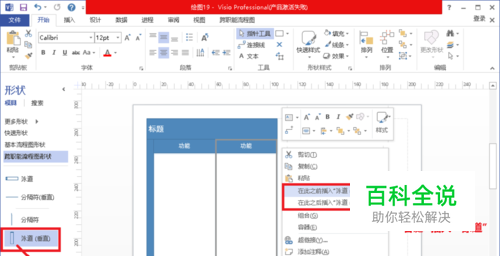 首先 新建一个跨职能流程图(流程图>跨职能流程图); 根据所需制作的跨职能图添加“泳道(垂直)”,根据示例为2条垂直“泳道”。添加“泳道”可以选择在左边跨职能流程图拖拉图标创建,也可以右键功能区插入“泳道”,方法很多,不做详解;