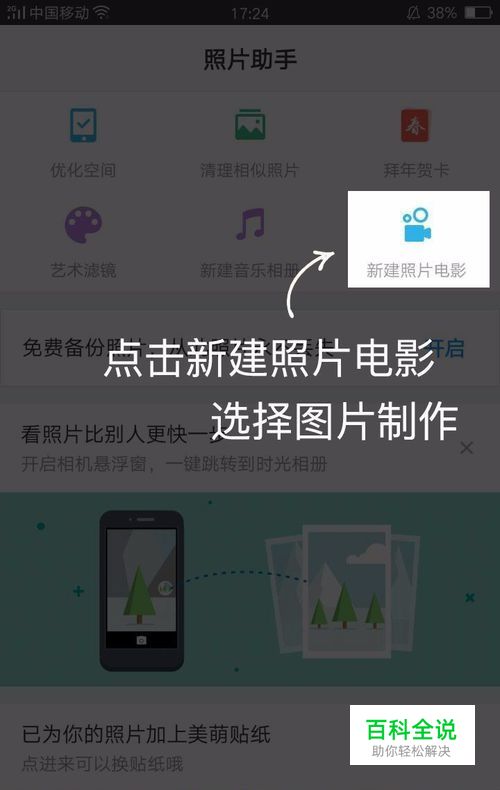 打开时光相册,按照以下步骤进行操作:照片助手-新建照片电影-选择照片-点击完成