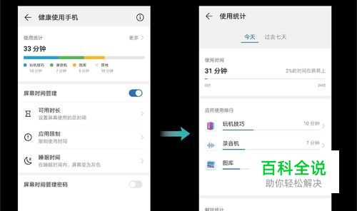 关注孩子的使用习惯,管理孩子使用手机时间和内容,让孩子健康享受科技的乐趣。 在【健康使用手机】界面,打开【屏幕时间管理】,选择【使用者】为【这是孩子的手机】,根据屏幕提示设置【可用时长】、【睡眠时间】、【屏幕时间管理密码】和【密码保护】,即可开启【屏幕时间管理】并设置好孩子使用手机的规则。