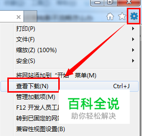 打开IE浏览器,点击右上角的“设置”按钮,从下拉菜单中选择“查看下载”项。