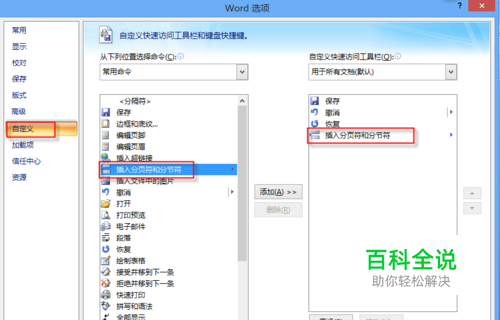 插入分节符 word选项-自定义-将插入分节符和分页符添加到自定义快速访问工具栏中
