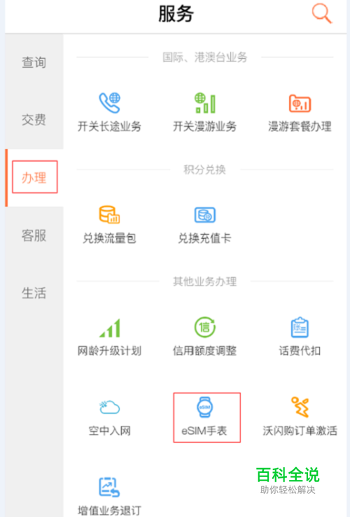 3、 点击 服务,选择办理 > eSIM手表 > 独立号码开通;