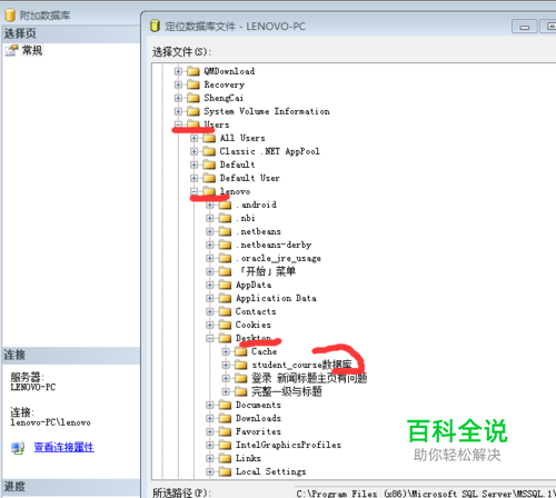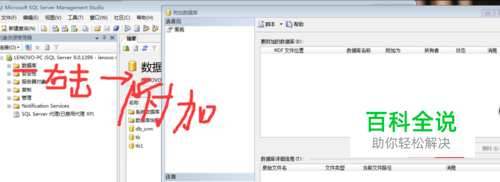 打开软件SQL Server 2005,如图,附加示例数据库,如图,将示例数据库放在桌面上,如图,附加数据库,然后点击“确定”,“确定”