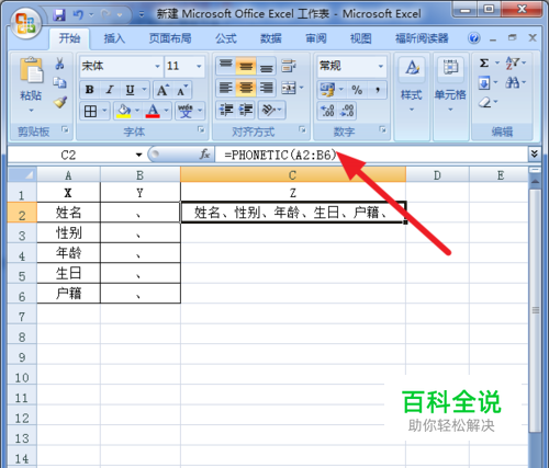 按照三中所讲的,输入顿号辅助列,然后再目标单元格输入公式即可 =PHONETIC(A2:B6)