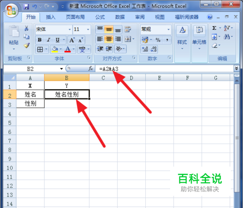 建立一个空excel表,输入两行数据,如图所示,只要在合并位置的单元格,输入 =A2&A3&A4 即可