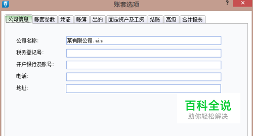 1、公司信息填写、单击账套选项,弹出账套选项对话框,在公司信息栏中如实填写:税务登记号、开户银行及账号、电话、地址