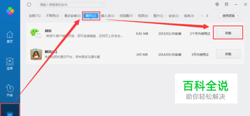 点击左下角的 卸载,选择 聊天,即可看到微信,然后点击右边的卸载按钮;