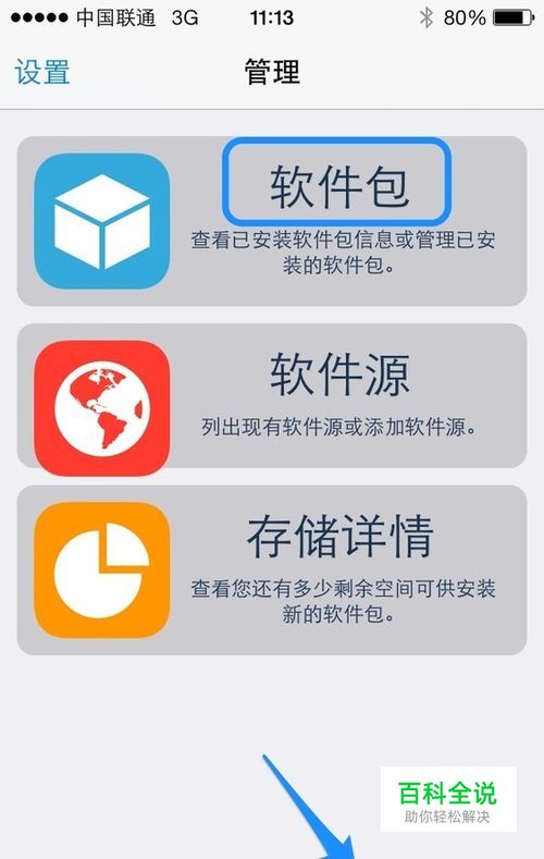 接下来请点击底部的 “管理”栏目,再点击 “软件包”选项,如图所示