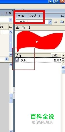 画好之后,回到舞台。 你会发现,右边有一个框体叫做 库 里面有我们刚刚创建的元件。 没错,库就是放元件的地方。
