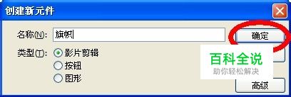 打开FLASH 进入上一课教程所提到的界面。 界面称之为场景,元件就是舞者。 我们既然要升旗,必须有旗子让我们来升,现在,我们来创建一个旗帜! 选择插入 新建元件 起好名字 点击确定。 这样,我们进入了元件创建页面。