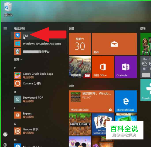 用户在"TIM,最近添加 (列表项目)"上左键单击(在"启动"中)。