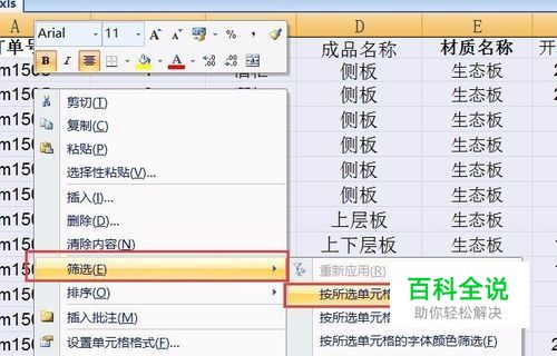在选择区域右击,在右击菜单中选择筛选,选择要筛选的依据,一般选择第一个,按单元格值筛选