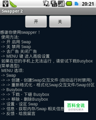 最后启动虚拟内存。在主界面单击顶部“开(ON)”按钮开始启动Swap分区。整个过程大约持续1-2分钟,期间会有几个“Fail”(失败);不要惊慌,这是因为SWAP需先加载后取得ROOT权限所致。第一次“ON”显示完成后,再一次单击“ON”直到出现“ALL DONE”启动成功。