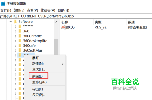 我们想要删除某个软件的注册表的话,我们就右击该文件夹,弹出的界面,我们点击删除就可以了。