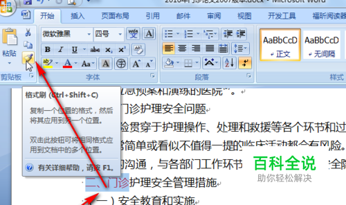 第一种方法是用格式刷,格式刷可以将一段文字的格式复制给另一段文字。格式刷的用法是选中改好的文字,然后单击格式刷。