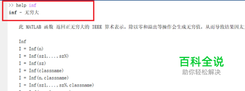 第二步我们也可以看一下matlab中inf的使用方法,在命令行窗口中输入“help inf”,如下图所示: