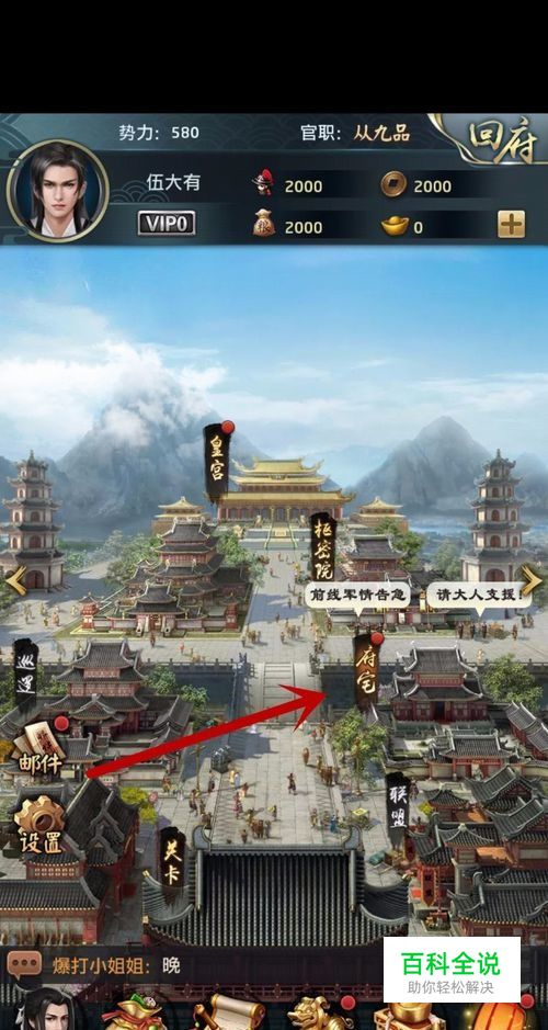 首先我们进入到麻雀飞青天游戏里面,在外城点击【府宅】,进入到府宅里面,如图所示。