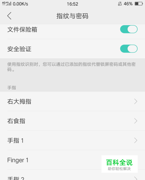 1、在设置指纹登录之前首先需要打开手机指纹功能,打开手机“设置”,找到“指纹密码”,开启此服务(录入自己的指纹即可)。