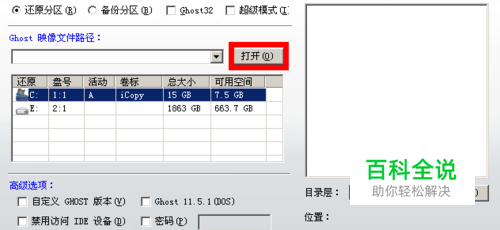 打开老毛桃一键还原,点高级模式→打开,找到提取的WinXp.gho→确定。如图: