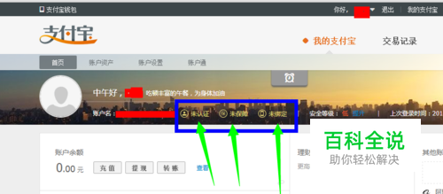 第一步:在支付宝首页登入支付宝账号,登入后在首页可以看到3个未认证的服务【未认证、未保障、未绑定】,如下图所示: