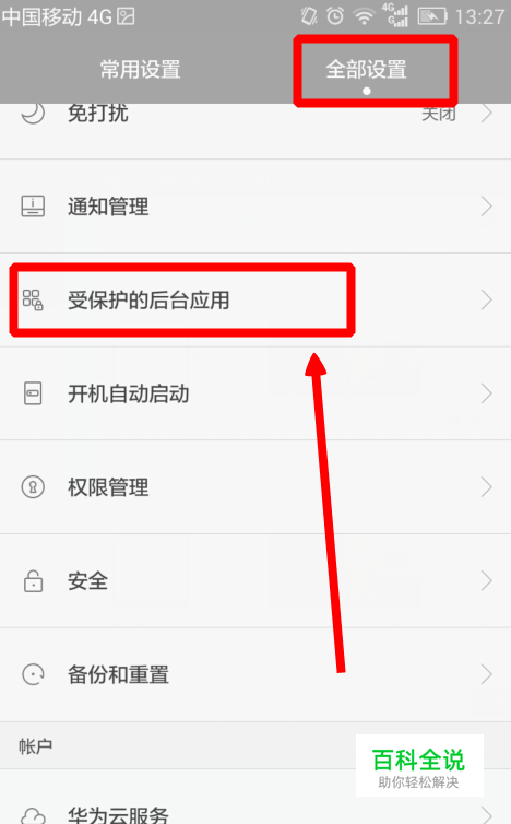 第二步:打开设置,在全部设置里找到 受保护的后台应用一项。