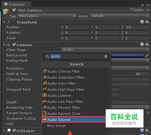点击“Add Component”按钮后,在搜索框中输入“Audio”关键字,在出现的下拉框中选中“Audio Source”选项,如下图所示。
