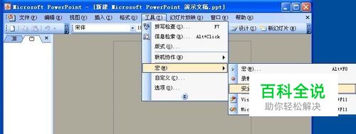 启动PowerPoint2003程序,在菜单栏中依次单击“工具”——“宏”——“安全性”