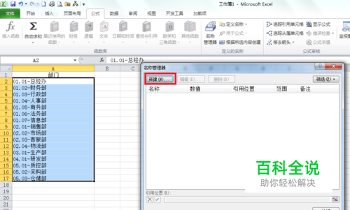 在弹出新界面里,设置名称,这里我们取"部门";并选择适用范围,默认为工作薄;引用位置自动产生,即为第1步选定区域。单击确定。