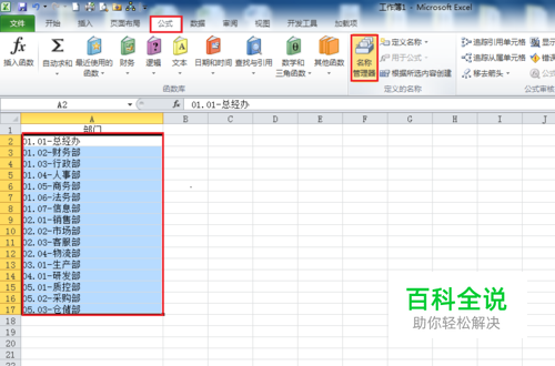 启动Excel,打开数据表格,选择A2:A17区域,单击菜单栏--公式--名称管理器。