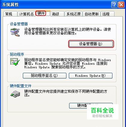 系统属性框里, 点击(硬件)顶栏,切换到这一页面。然后点击(设备管理器)。