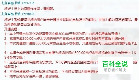 4、最后,客服和之前联系的骗子会劝你尽快开通“自动发货功能”,以骗取你更多的人民币。如果你不开通这个“功能”,你买的商品就会永远处于“正在交易中”。