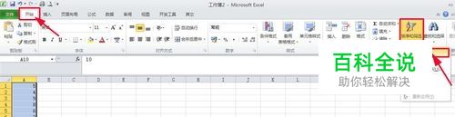 现在我想对单元格区域A1:A10进行排序 先选择区域A1:A10,然后点击“开始”选项卡中的“排序与筛选”下拉菜单中的“升序” 见下图