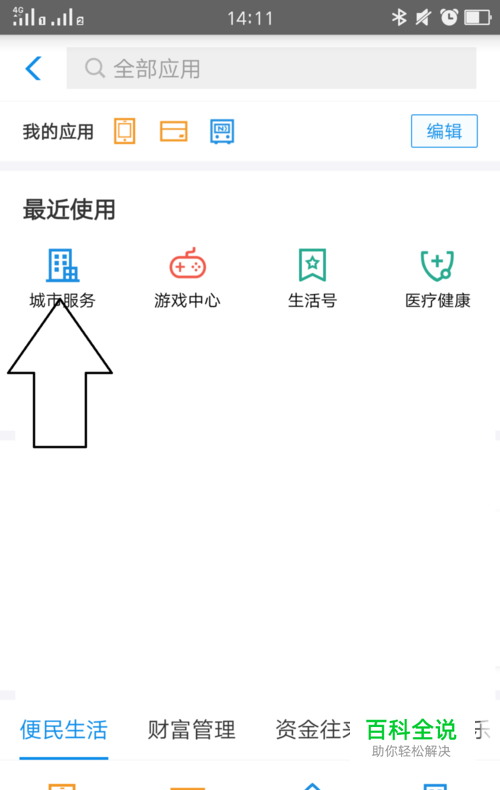 点击更多,进入到全部应用界面找到城市服务,如图