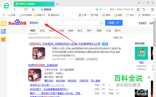 首先我们打开搜索引擎并搜索“阴阳师”进行搜索,如图所示;