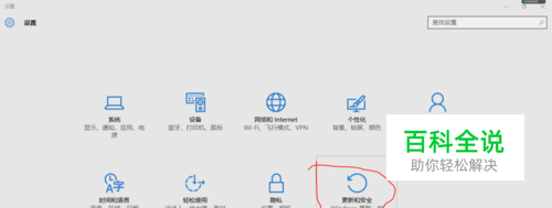 选择“更新和安全”,此项包含Windows更新、安全和备份选项,也就是说,要实现系统的恢复、升级、安全设置,都是通过这个选项进入。