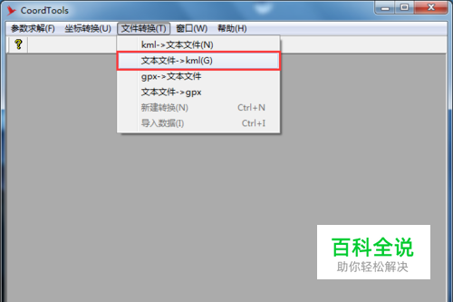 打开CoordTools软件,选择【文件转换】菜单下的【文本文件->kml】菜单项