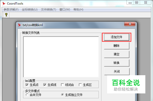 在弹出的对话框中添加文件并进行必要的设置 1、勾选需要生成的标记类型(点、线、区以及是否需要线闭合) 2、如果添加了多个文件,选择【合并文件】将所有数据生成一个kml,【生成独立文件】将生成与各数据文件同名的kml文件