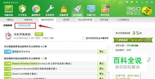 在优化加速的页面里,我们点击“我的开机时间”然后点击“开机历史记录”
