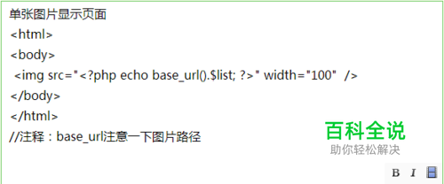 /** * 查看单张图片操作(该调用方式是根据图片的名称或者是id查询某一张图片,而不是查询许多图片,) */ function look(){ //加载数据 //$name='fb8fa296e7559b7bd5254b4fe0102181.jpg'; $this->load->model('TestsDao'); $list = $this->TestsDao->lookphoto($name); $li['list']=$list['photoadd']; //加载页面 $this->load->helper('url'); $this->load->view('User/photo',$li); echo 'success....'; } //注释:$name为图片的名称 //调用这个方法的时候,需要填写图片名称或者图片的id号