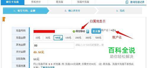 在充值号码的后方分别显示了该号码的归属地和用户名的一个字,方便我们核对号码是否正确,在下方选择需要充值的面额,点击开始充值。